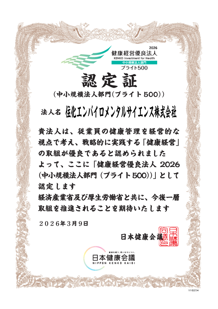 住化エンバイロメンタルサイエンスでは、2019年11月に「健康経営宣言」を策定し、健康の維持、増進を支援する取り組みを開始、その取り組みが認められ、2021年には「健康経営優良法人(中小規模法人部門)」に認定されました。