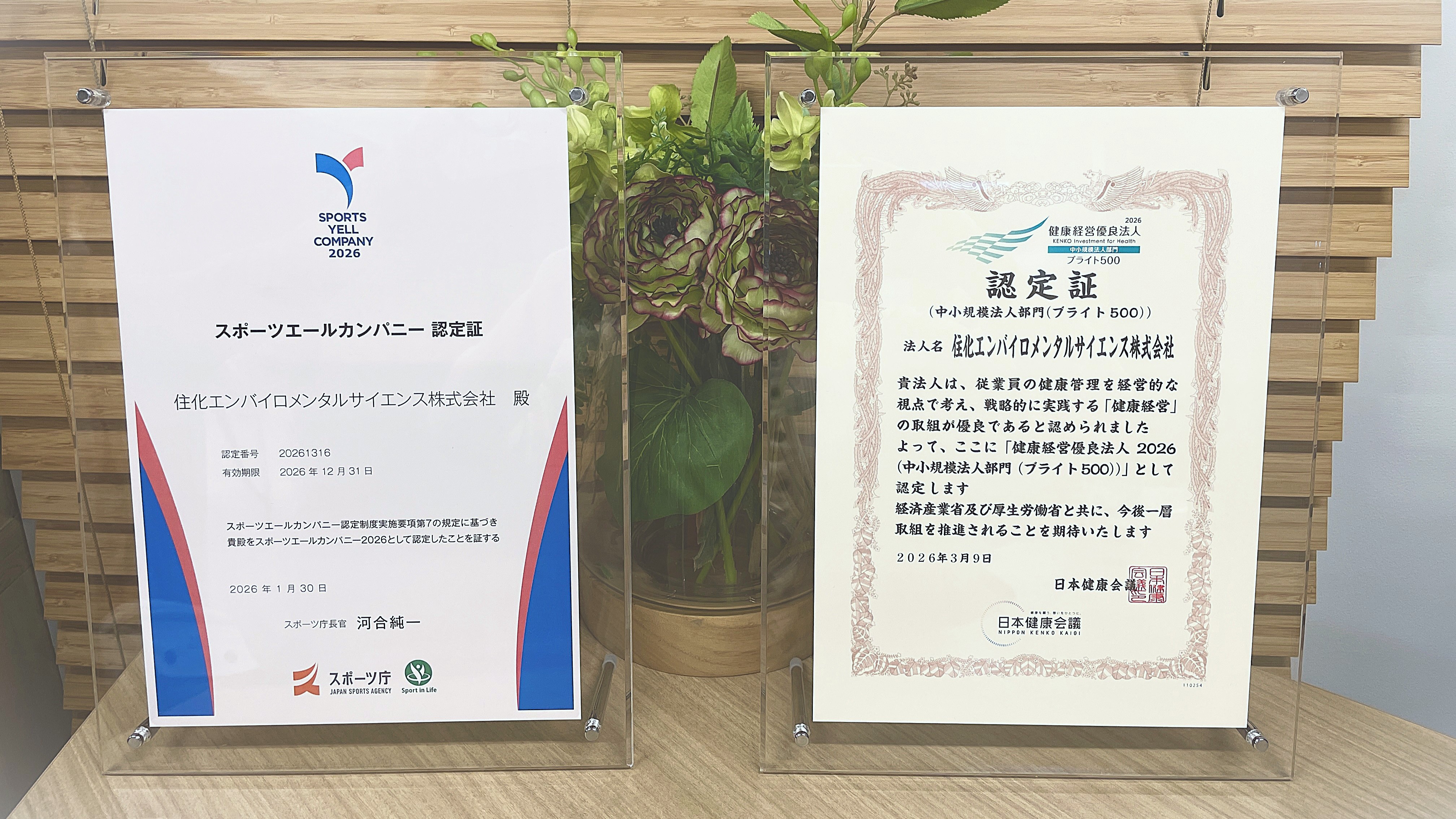 写真(左より)スポーツエールカンパニー2026認定証・健康経営優良法人2026ブライト500認定証