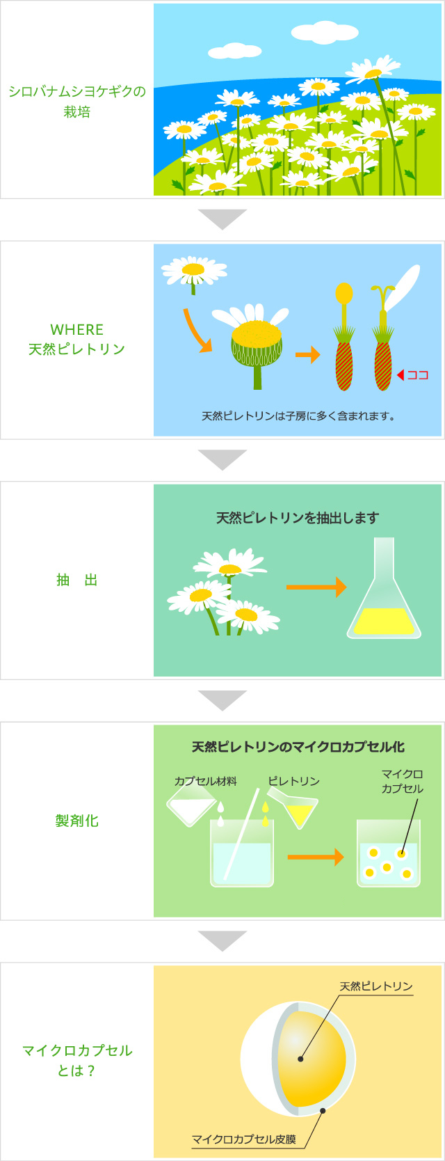 シロバナムシヨケギクから抽出する殺虫成分を「天然ピレトリン」といいますが、この成分はとてもデリケートです。光や空気にさらされると、数日~数十日で分解してしまうのです。効果も毒性もすぐになくなってしまいます。